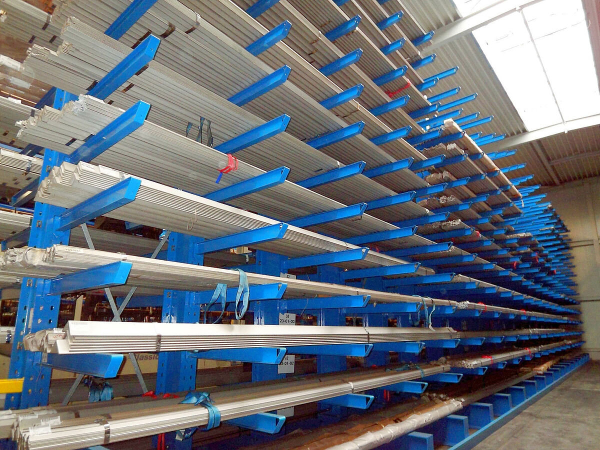 De oplossing was een draagarmstelling-systeem met een hoogte van 7,50 m en 14 opslaglagen boven elkaar, met een draagvermogen van per draagarm 1.200 kg met een lengte van 1.250 mm.