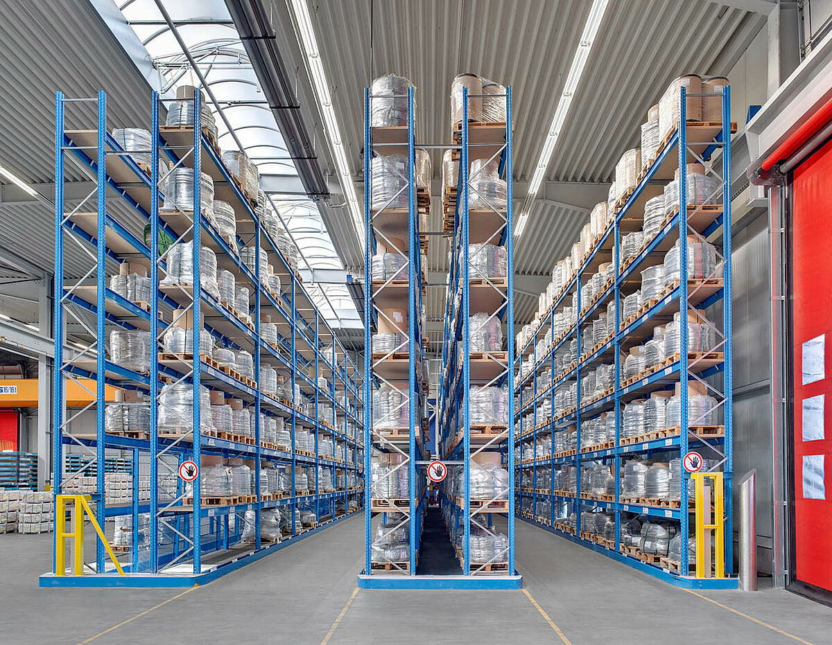 Door geleiderails aan de staanders van de stellingen en het gebruik van Hubtex vierwegheftrucks, was het mogelijk de gangpaden maar 2,42 m breed te maken. Deze moesten op hun beurt van een beveiligingssysteem voor gangpaden worden voorzien, om botsingen tussen personen en heftrucks in deze smalle gangpaden te voorkomen.