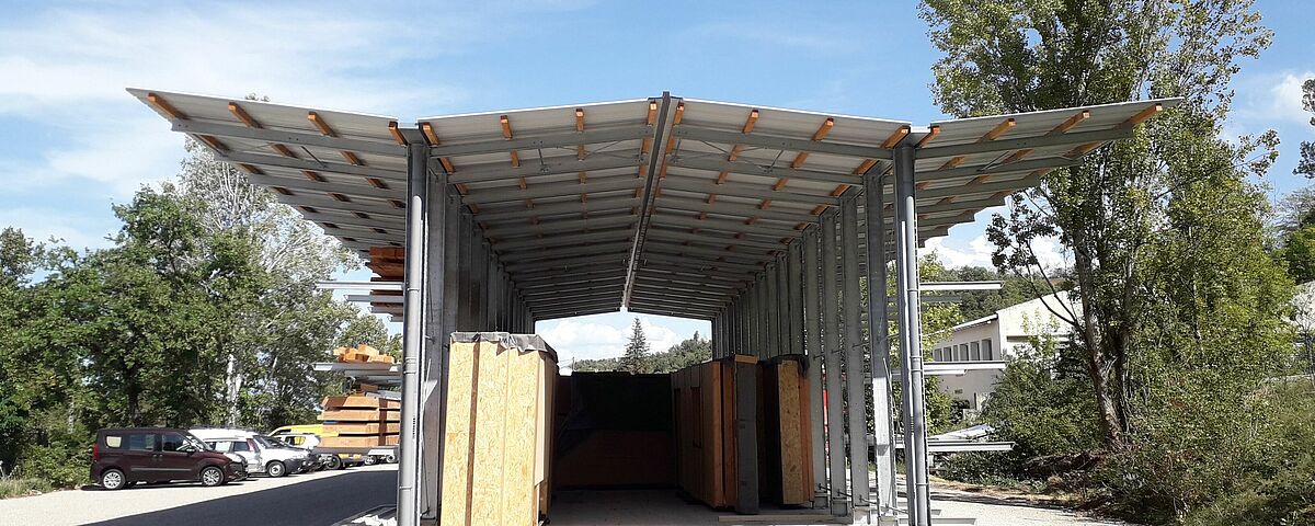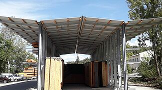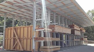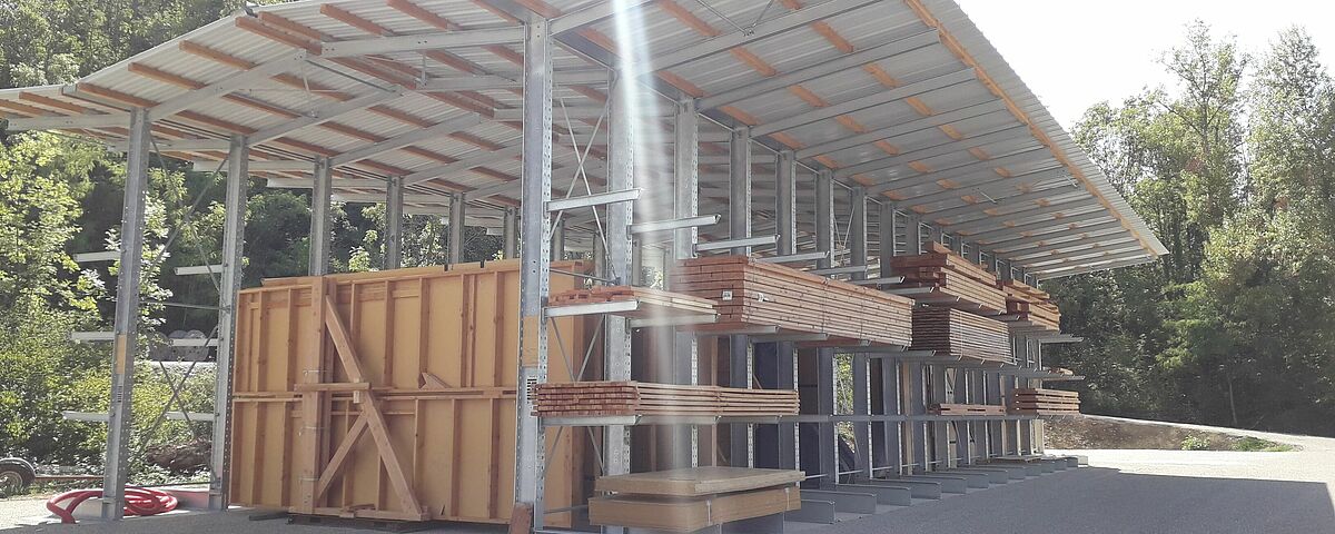 Het Franse timmerbedrijf / houtskeletbouw / gespecialiseerd in de bouw van met stro geïsoleerde woningen Bati-Nature heeft met een speciaal stellingsysteem van OHRA nieuwe capaciteit gecreëerd voor de opslag van zowel houtmaterialen alsook geprefabriceerde wandelementen. Twee 24 meter lange draagarmstellingen met geïntegreerde dakarmen vormen de wanden van een halachtige constructie. Daartussen blijft een ongeveer 6 meter brede, toegankelijke ruimte over voor vloeropslag. OHRA had slechts anderhalve week nodig voor de montage van deze speciaal ontworpen opslagruimte.