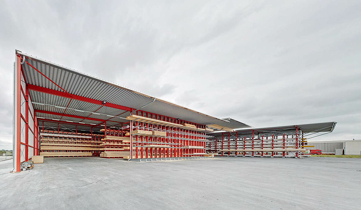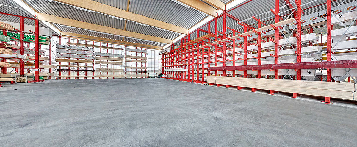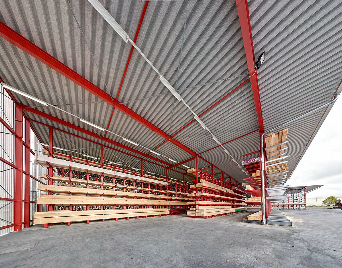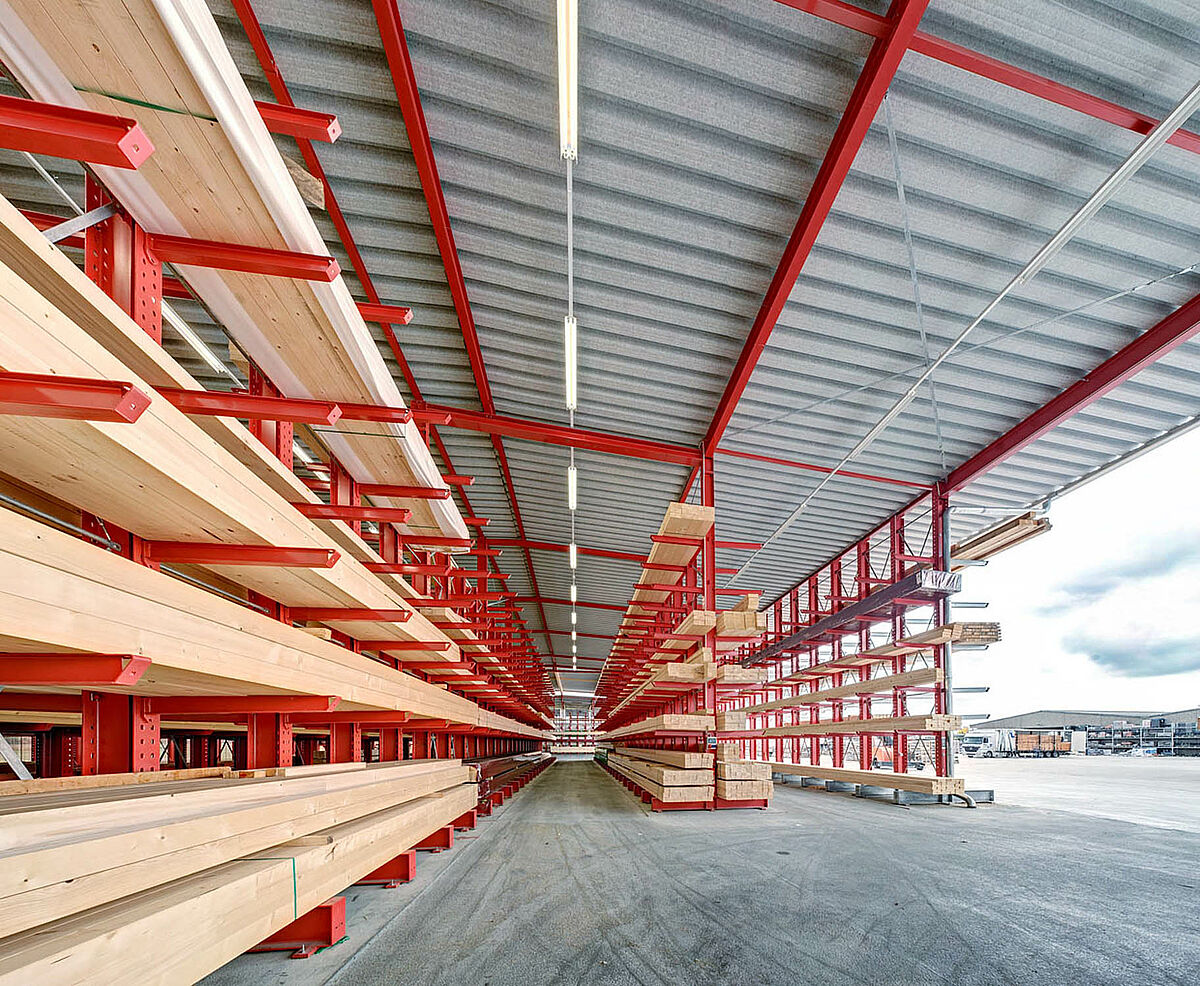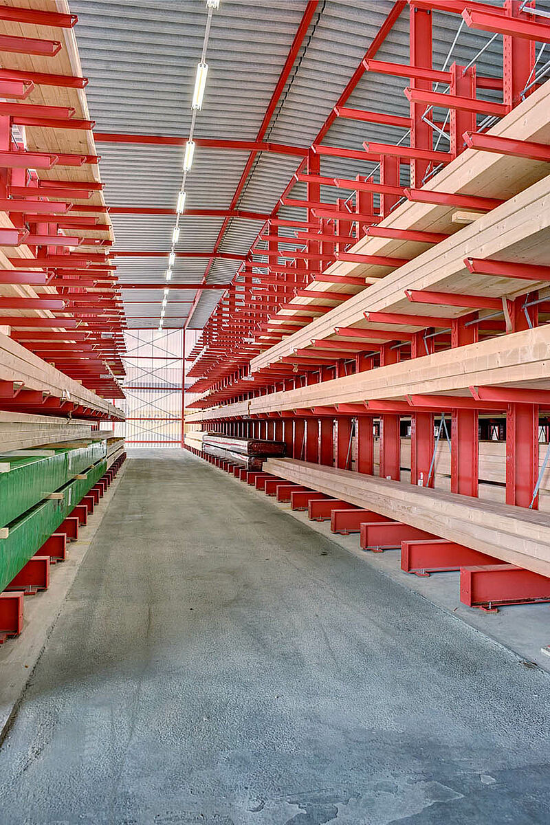 De dubbele draagarmstellingen zijn op het hoogste punt 8.600 mm hoog en bieden 6 opslagniveaus aan elke zijde van de stelling. Bij een draagvermogen van 800 kg per draagarm kan zo bijvoorbeeld in een rij stellingen met 33 staanders, materiaal met een totaalgewicht van 24,4 t op één opslagniveau worden ondergebracht. Het totale gebruikte oppervlak voor de nieuwe houtopslag bedraagt circa 3.100 m2. De nokhoogte bedraagt 9.750 mm. Hierbij moet in aanmerking worden genomen dat onze klant voor de dakconstructie een combinatie van stalen – en verlijmd houten binten heeft gekozen. De breedte van de overspanning bedraagt circa 21.000 mm. Door dit in eigen beheer te maken kon onze klant zich daarmee bij de uitvoering geld besparen.