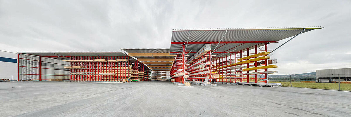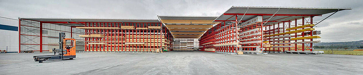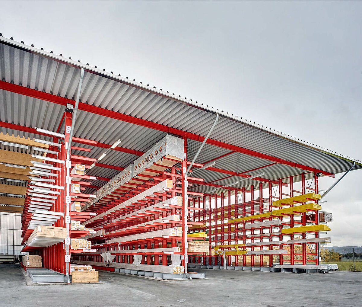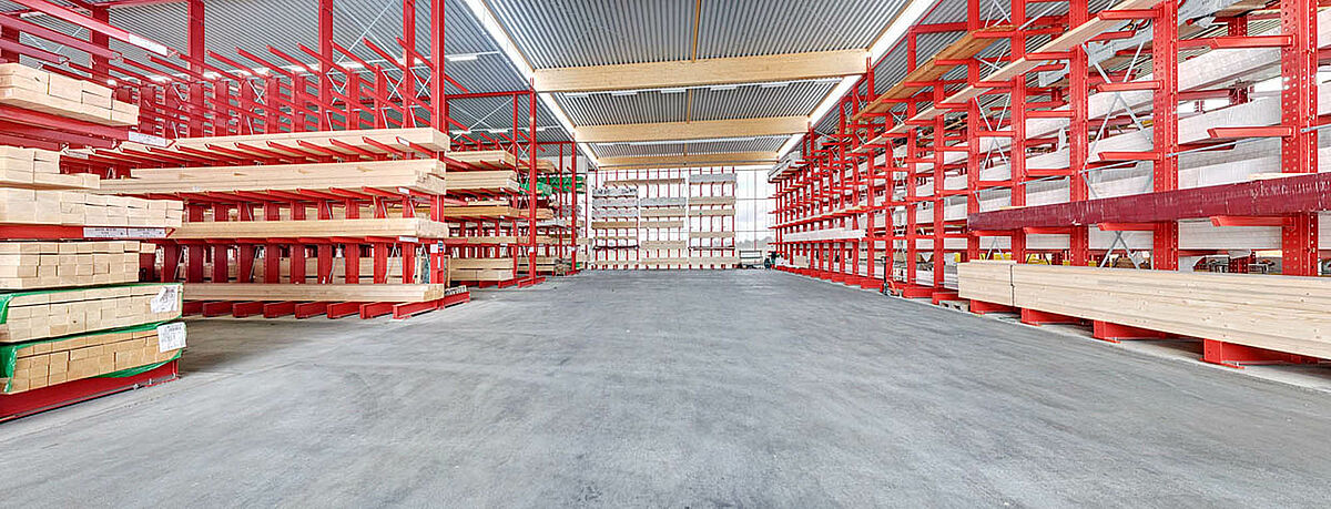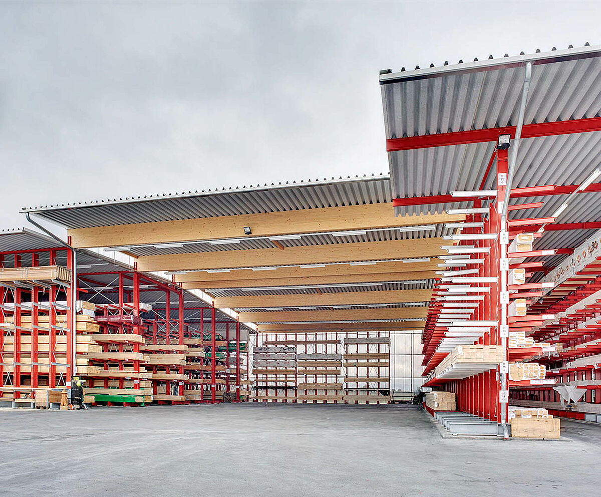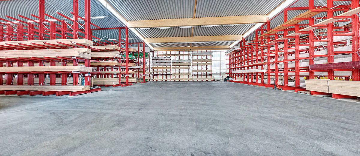 De dubbele draagarmstellingen zijn op het hoogste punt 8.600 mm hoog en bieden 6 opslagniveaus aan elke zijde van de stelling. Bij een draagvermogen van 800 kg per draagarm kan zo bijvoorbeeld in een rij stellingen met 33 staanders, materiaal met een totaalgewicht van 24,4 t op één opslagniveau worden ondergebracht. Het totale gebruikte oppervlak voor de nieuwe houtopslag bedraagt circa 3.100 m2. De nokhoogte bedraagt 9.750 mm. Hierbij moet in aanmerking worden genomen dat onze klant voor de dakconstructie een combinatie van stalen – en verlijmd houten binten heeft gekozen. De breedte van de overspanning bedraagt circa 21.000 mm. Door dit in eigen beheer te maken kon onze klant zich daarmee bij de uitvoering geld besparen.