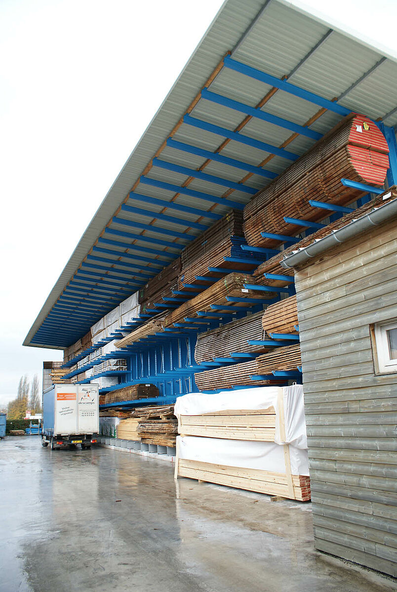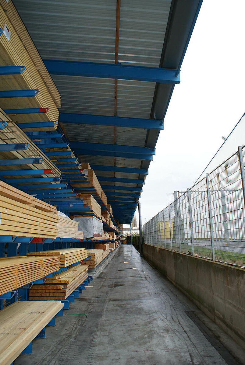 Voor de oplossing van deze opslagproblemen kon onze klant nu kiezen tussen de bouw van een conventionele hal of de bouw van een stellinghal door OHRA. Met het oog op de beschreven eisen heeft Descamps voor de oplossing van OHRA gekozen. Met deze variant kon niet alleen de overkapping worden gerealiseerd maar ook nog extra opslagcapaciteit worden gecreëerd. Door de toepassing van robuuste draagarmstellingen kon ook de buitenkant van de overdekte hal als opslag worden gebruikt voor producten waarvoor geen of maar weinig bescherming tegen weersinvloeden nodig is. Deze producten werden tot dan toe in een ander gebouw opgeslagen.