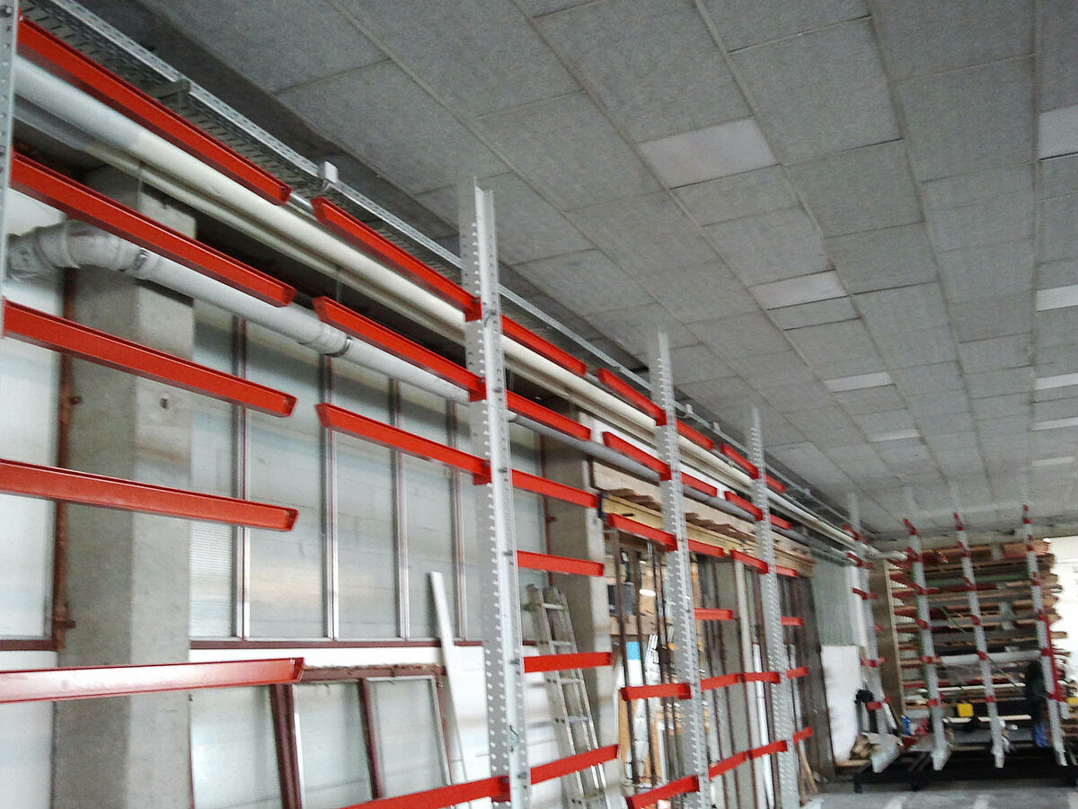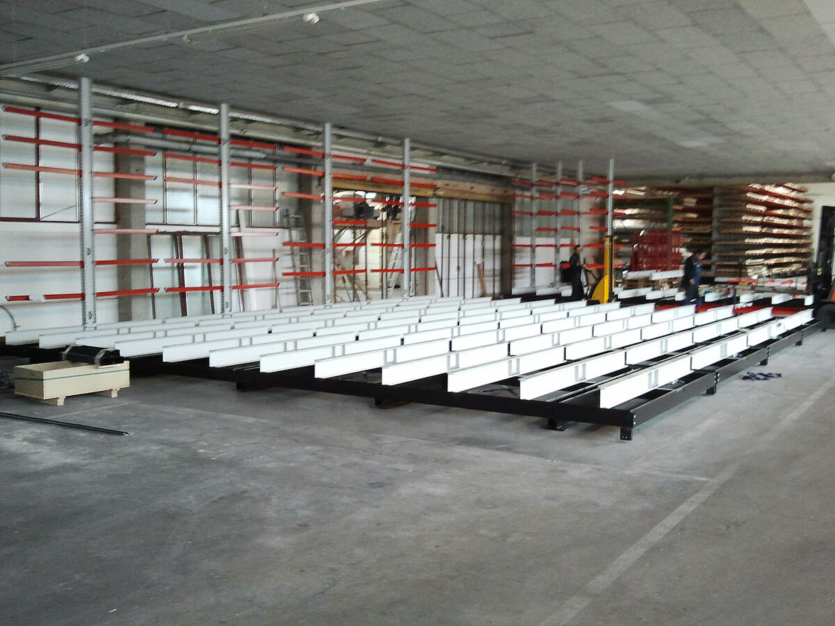 Die vond erform bij OHRA: de in Kerpen bij Keulen gevestigde specialist in draagarmstellingen biedt een systeem waarbij de stellingen op verrijdbare onderstellen worden gemonteerd. Deze verrijdbare stellingen maken bijna 100 procent meer opslagcapaciteit mogelijk dan normale, vast gemonteerde stellingen. De experts van OHRA monteerden bij erform een installatie met vijf 9 meter lange, tweezijdige draagarmstellingen. Binnen een hoogte van 4080 millimeter zijn zeven stellingniveaus gerealiseerd. Naast de op de verrijdbare onderstellen gemonteerde stellingen biedt een vaststaande, eenzijdige stelling nog meer opslagoppervlak.