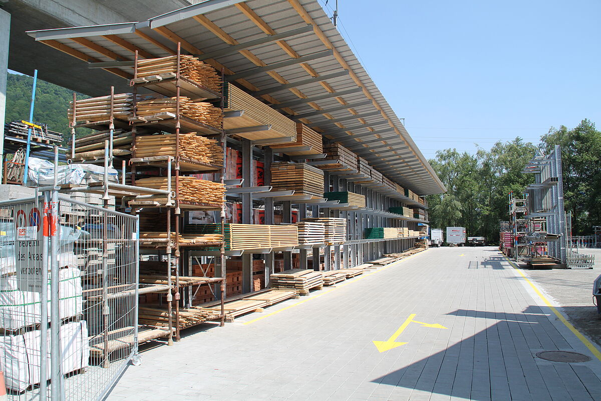 De terreinen van Gottlieb Müller in Rothrist vormen sinds begin 2018 het operationele platform voor de hoogbouw- en diepbouwprojecten van het bedrijf. Om de verscheidenheid aan bouwmaterialen en voorraden efficiënt op te slaan, besloot de firma Gottlieb Müller om twee soorten rekken te gebruiken: Het magazijn is in principe uitgerust met 16 3,5 meter hoge en 8,45 meter lange palletstellingen. Elke vak bevat drie europallets of palletboxen met elk een maximumgewicht van 1000 kilogram. Zeven 3,64 meter hoge, eenzijdige draagarmstellingen bieden extra opslagcapaciteit in de hal. Sommigen beschikken over armbruggen en bodemlegborden, zodat naast lange goederen zoals buizen of platen ook ladingdragers van verschillende afmetingen kunnen worden opgeslagen zonder storende staanders. Andere vrijdragende rekken werden buiten opgesteld; ze worden door een vuurverzinking tegen corrosie beschermd. Hier domineert vooral een 43,5 meter lange rij legborden. De bovenste armen zijn ontworpen als dakarmen: Ze dragen aan elke zijde een 2,7 meter diep, licht hellend dak. Aldus worden de opgeslagen houtbouwmaterialen beschermd tegen directe invloed van neerslag. De draagarmen van alle schappen hebben een laadvermogen van 1.200 kilogram per arm.