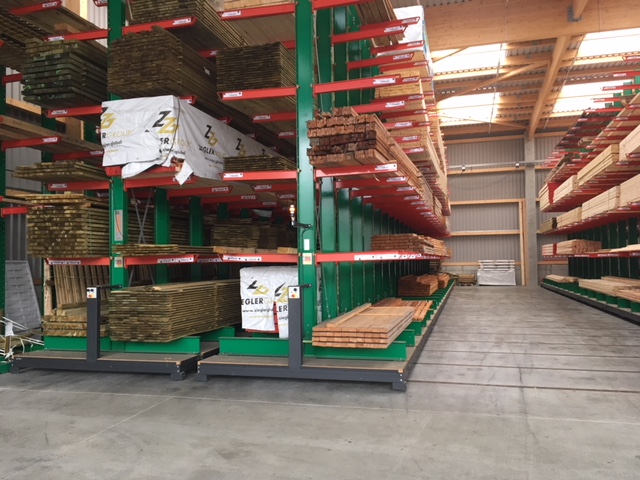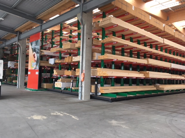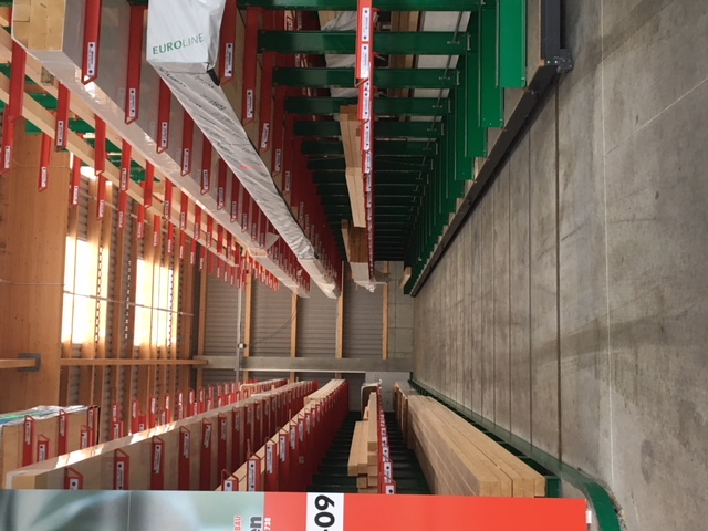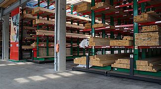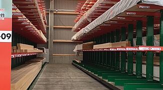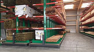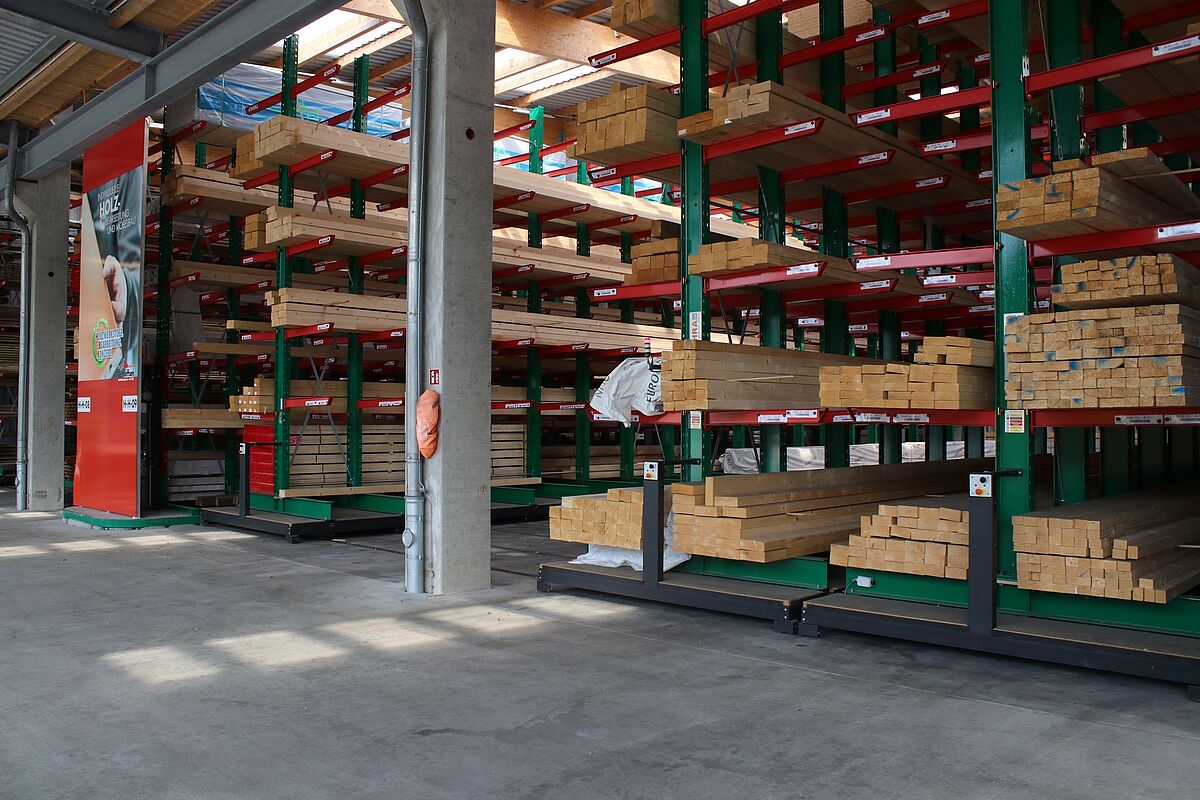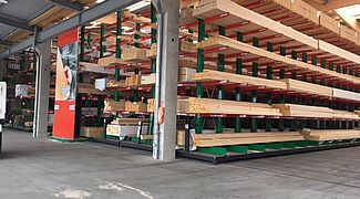 In het magazijn worden de bouwmaterialen toegewezen op basis van de opdrachten van vakmensen en privébouwers. Onder de artikelen die hier worden opgeslagen, bevinden zich tal van bouwmaterialen, zoals balken van wel 13 meter lang en goederen in zakken. Om de klanten een zo groot mogelijk assortiment van goederen te kunnen aanbieden, lag de hoofdfocus van de modernisering op een verhoging van de opslagcapaciteit – tot nog toe werden de artikelen uitsluitend opgeslagen in multi-line draagarmstellingen.