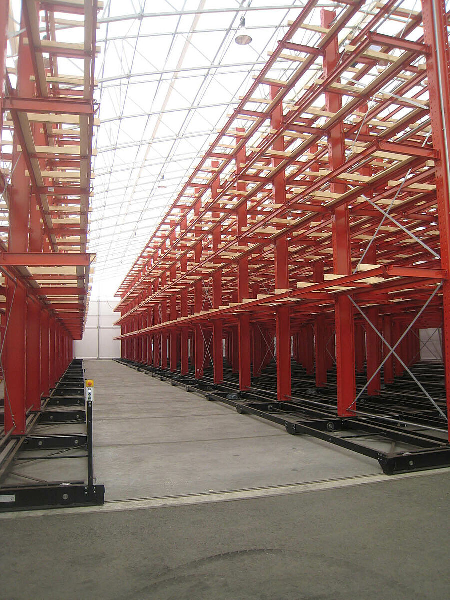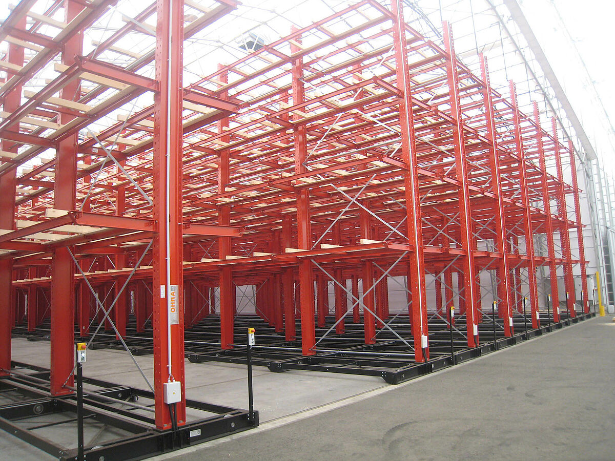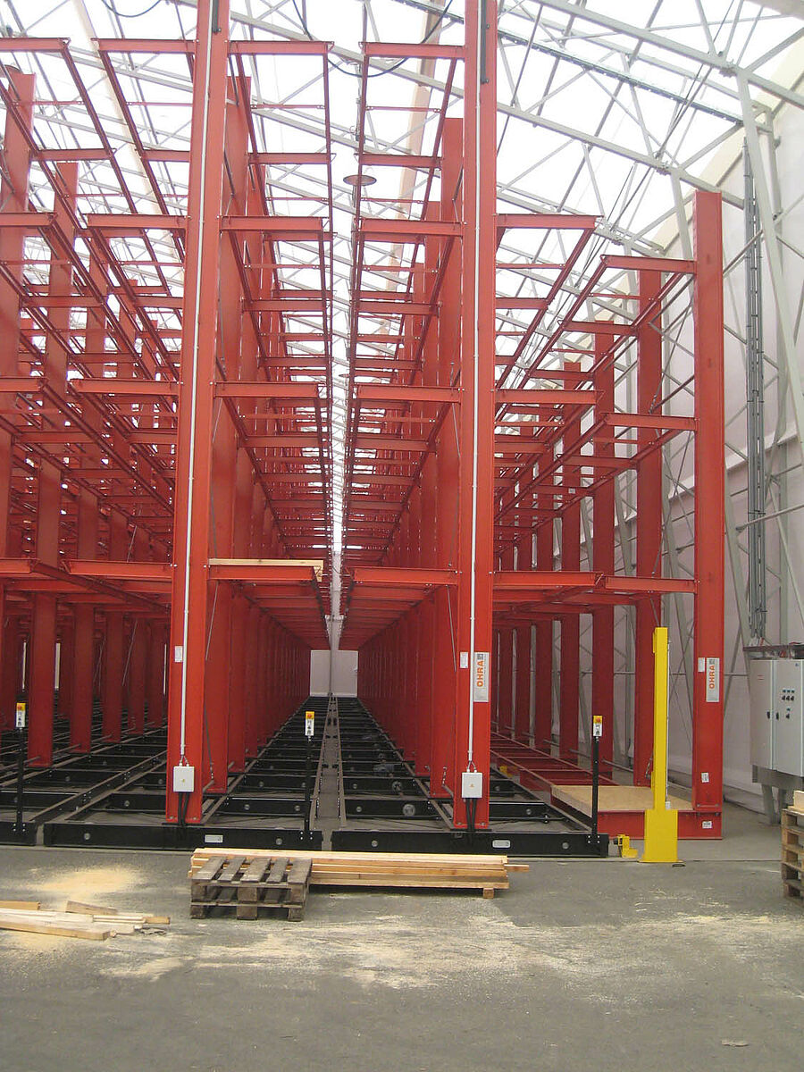 OHRA nam de montage van de hele stellinginstallatie op zich. Daarbij hoorde ook de montage van de benodigde verrijdrails, die nog voor de bouw van de eigenlijke hal in de open lucht plaatsvond. Van de in totaal tien 60 meter lange en met vier tot vijf niveaus tot 9,2 meter hoge draagarmstellingen werden er twee vast in de vloer verschroefd. De overige acht werden op 58 meter lange verrijdbare onderstellen van OHRA gemonteerd. De onderstellen worden elektrisch aangedreven en kunnen op afstand vanaf de vorkheftruck uit elkaar worden gereden. Alleen de gewenste gang opent zich; hierdoor wordt de opslagcapaciteit op het beschikbare oppervlak bijna verdubbeld.