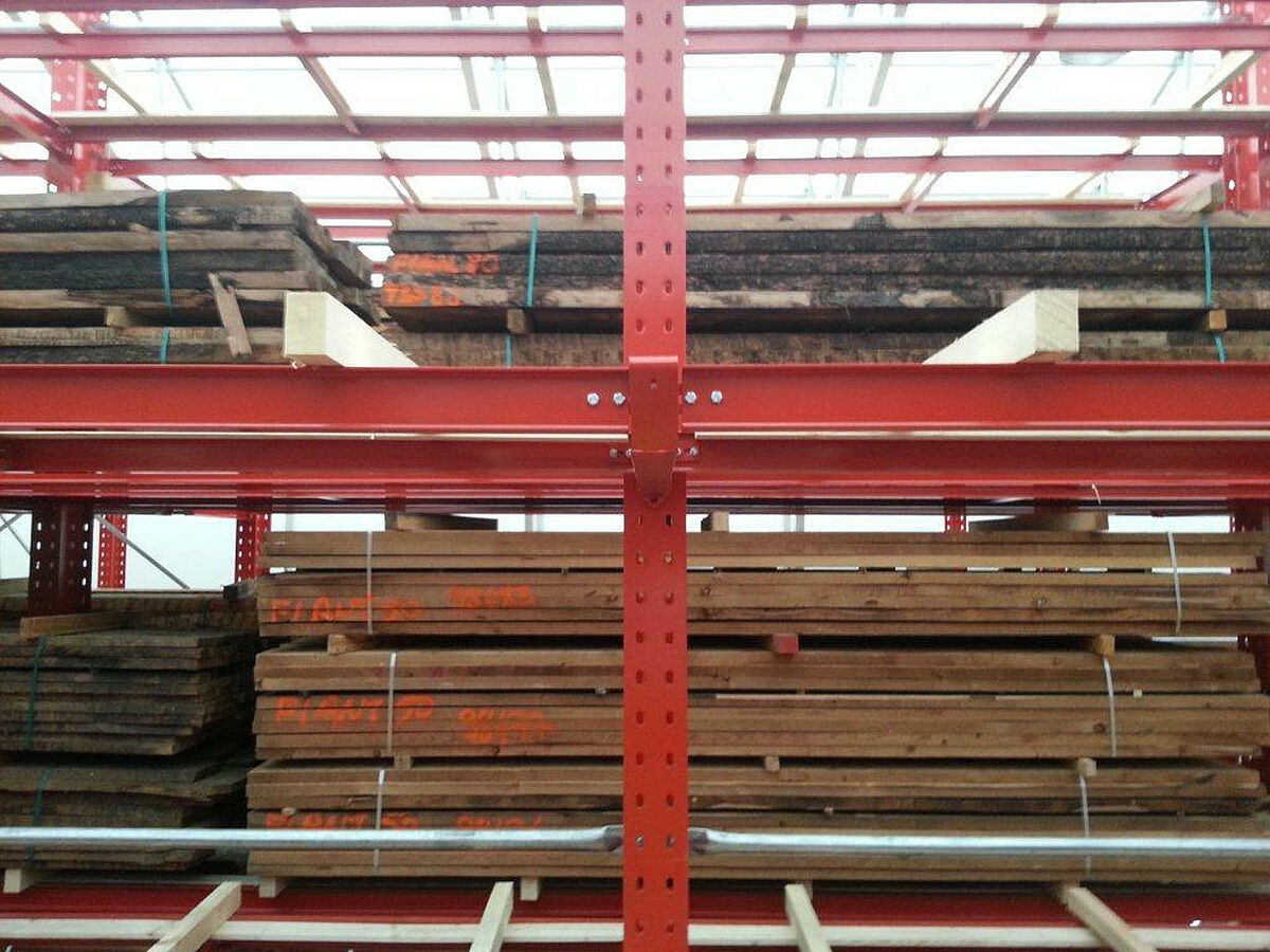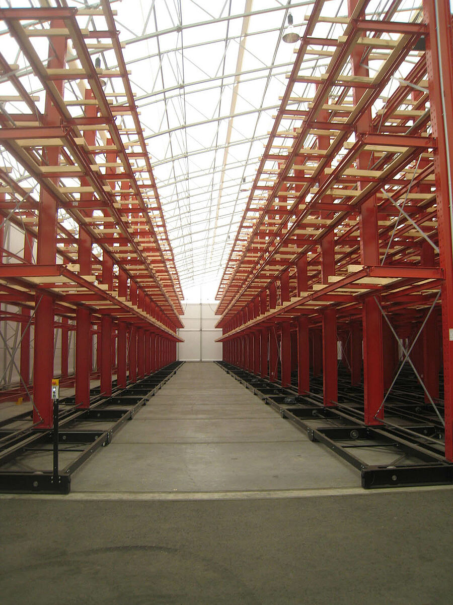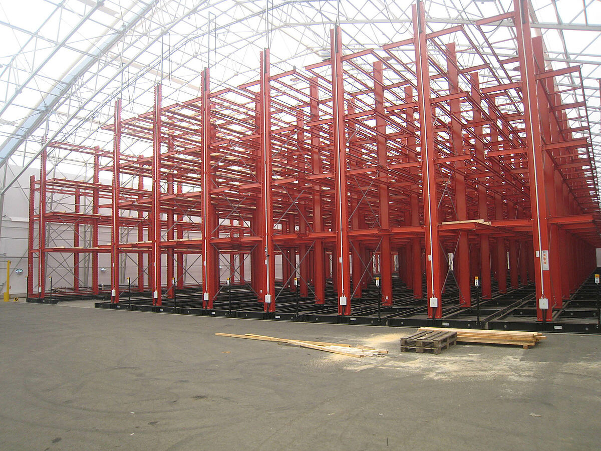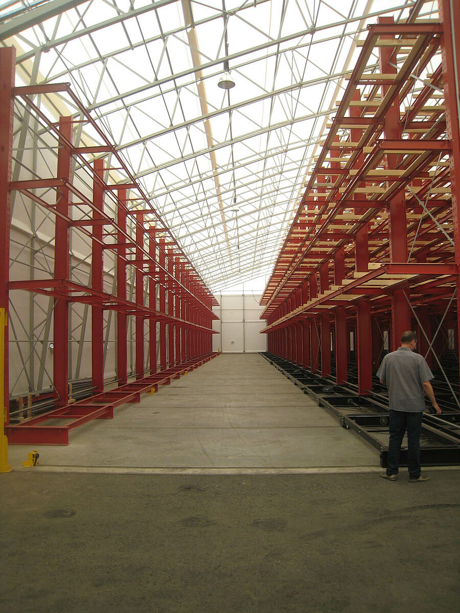 OHRA nam de montage van de hele stellinginstallatie op zich. Daarbij hoorde ook de montage van de benodigde verrijdrails, die nog voor de bouw van de eigenlijke hal in de open lucht plaatsvond. Van de in totaal tien 60 meter lange en met vier tot vijf niveaus tot 9,2 meter hoge draagarmstellingen werden er twee vast in de vloer verschroefd. De overige acht werden op 58 meter lange verrijdbare onderstellen van OHRA gemonteerd. De onderstellen worden elektrisch aangedreven en kunnen op afstand vanaf de vorkheftruck uit elkaar worden gereden. Alleen de gewenste gang opent zich; hierdoor wordt de opslagcapaciteit op het beschikbare oppervlak bijna verdubbeld.