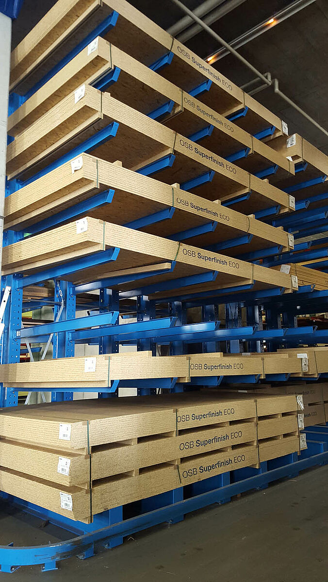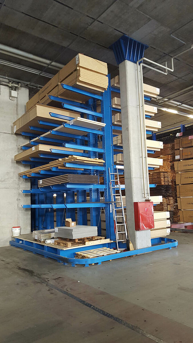 Omdat het magazijn plaats moest bieden aan zeer verschillende platen (massief houten platen, OSB-plaat, spaanplaat, triplex/multiplex, MFP-plaat en ook kwetsbare fineerplaat) was een multifunctioneel stellingsysteem noodzakelijk. Gfeller breidde daarom het aanwezige magazijn uit met draagarmstellingen van OHRA: het in Kerpen in Duitsland gevestigde bedrijf is Europees marktleider in draagarmstellingen. Alle dragende elementen van de stellingen zijn gemaakt van massief, warmgewalst staal. De stabiele constructie maakt grote opslaghoogten en een slanke bouwwijze mogelijk, zodat een hoger oppervlaktegebruik mogelijk is. Bij Gfeller zijn meer dan 7 meter hoge staanders gebruikt, waarmee opslag op negen niveaus kon worden gerealiseerd.