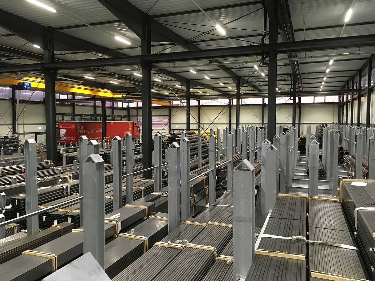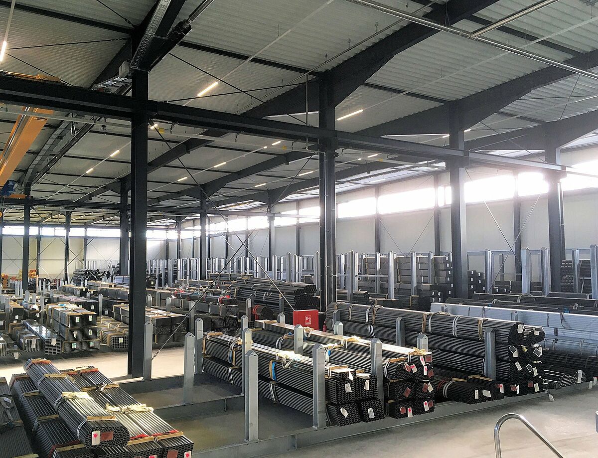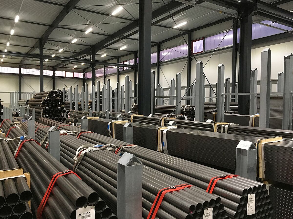 Met een nieuw centraal magazijn voor buizen in Chemnitz heeft HTI Dinger & Hortmann, groothandel in civiele techniek en industriële technologie, de efficiëntie van haar logistieke processen aanzienlijk verhoogd. Een groot aantal aanzienlijk langere en zwaardere buizen, bijvoorbeeld buizenbundels, zijn opgeslagen in 30 rongenstellingen van OHRA. De vlakke opslag maakt het gericht laden en lossen van de afzonderlijke buistypes mogelijk met vier bovenloopkranen. De buizen kunnen ook rechtstreeks van de vrachtwagen naar de rongenstellingen getransporteerd worden - zonder dat ze gedraaid of neergezet hoeven te worden of een andere lastophanging gebruikt hoeft te worden. De selectieve toegang tot de buizen en de eenvoudige bediening maken een bijzonder efficiënte buizenlogistiek mogelijk. Daarnaast bieden draagarmstellingen, ook van OHRA, ruimtebesparende ruimte aan de binnen- en buitenmuren van de hal voor lichtere buizen van kunststof of dunwandig staal.