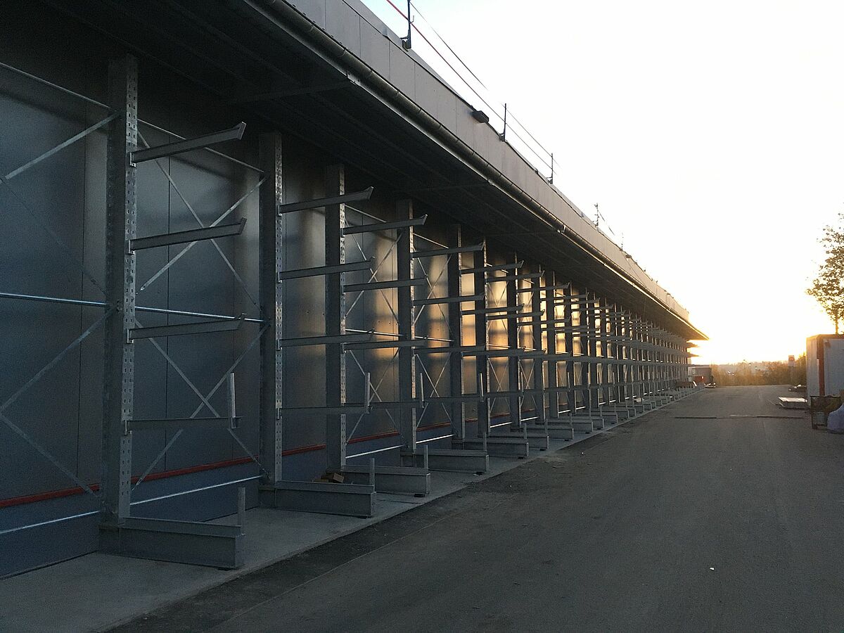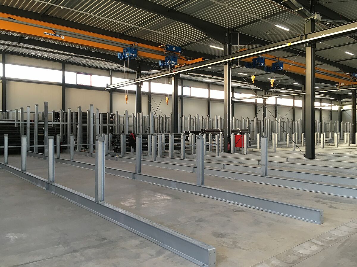 Terwijl de zware en lange buizen of buizenbundels hun plaats vinden in de rongenstellingen, worden lichte buizen opgeborgen in OHRA-draagarmstellingen. De circa 5 meter hoge, verzinkte stellingen zijn enerzijds bevestigd aan de binnenwanden van de hal en anderzijds rondom aan de buitenmuren. Pluggen en hulzen aan de uiteinden van de 1,4 meter lange en tot 640 kg dragende lange armen zorgen voor een veilige opslag van de buizen.
