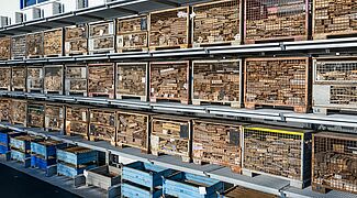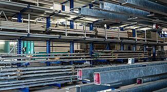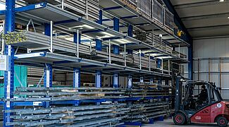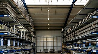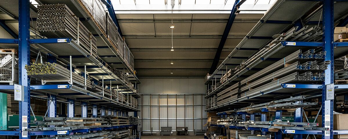 De inhomogene opgeslagen goederen vormden een uitdaging: Artikelen met verschillende gewichten, lengtes en hoogtes en in verschillende opslaghulpmiddelen (o.a. dozen, pallets, rekken met vier hoekpoten) moeten in de nieuwe rekken passen. "In de praktijk was het belangrijk voor ons om alle bestaande magazijngoederen in slechts één opslagsysteem op te slaan," zegt Fabian Bechtold, bedrijfsleider van LEUBE. Om dit mogelijk te maken, werden alle opslagniveaus van de draagarmstellingen voorzien van roosterbodems. Hierdoor kunnen artikelen stuk voor stuk flexibel en naadloos worden opgeborgen.