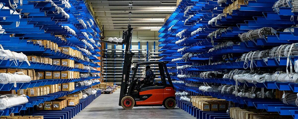 Het gebruik van vorkheftrucks vormde dan ook de basis voor het concept van het nieuwe langgoedmagazijn: blank en roestvast staal moeten worden opgeslagen in lange formaten en bundels van 3 tot 6 meter in draagarmstellingen. Op deze manier zijn afzonderlijke artikelen snel en gericht met de heftruck bereikbaar. Er moeten standaard vorkheftrucks van de klasse van 5 ton worden gebruikt die gemakkelijk lasten tot 4 ton kunnen verplaatsen. Elk compartiment van het rek moet met een vorkheftruck kunnen worden gevuld om de processen zo eenvoudig mogelijk te houden. Wiedmann bepaalde 5,5 meter als veilig haalbare hefhoogte.