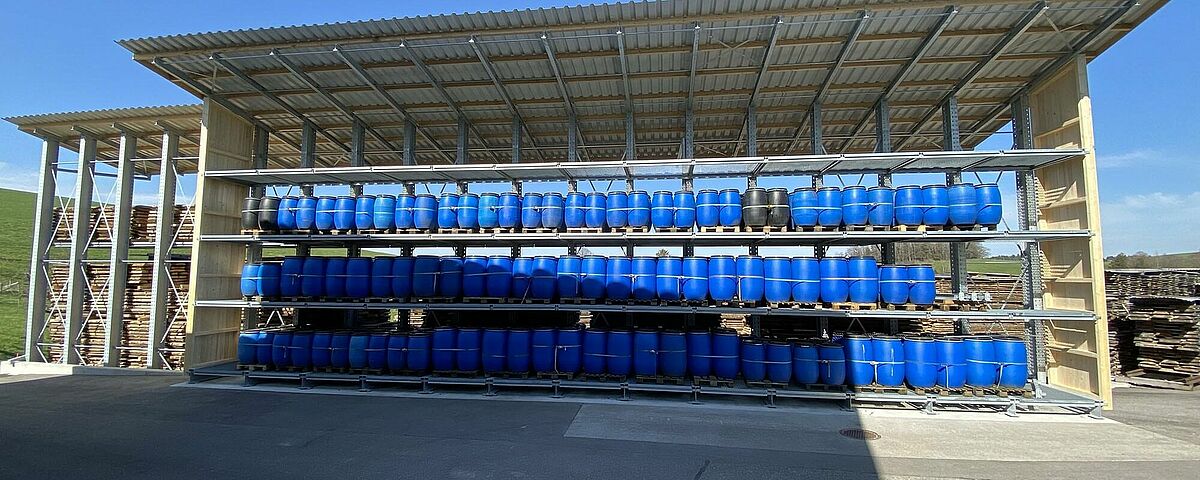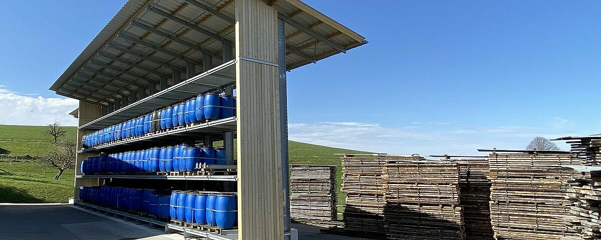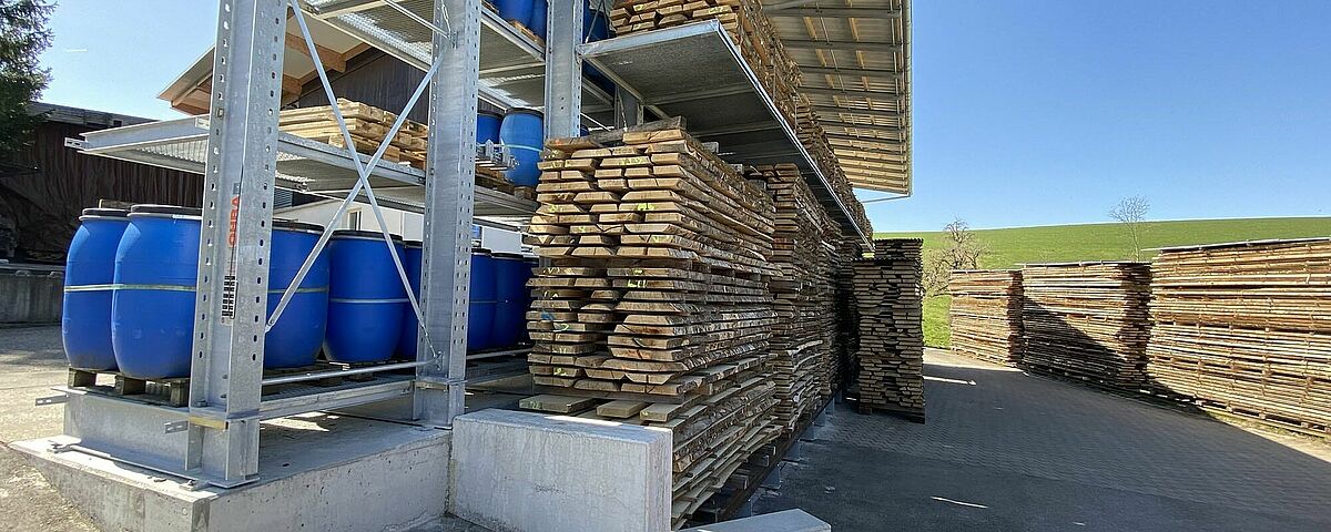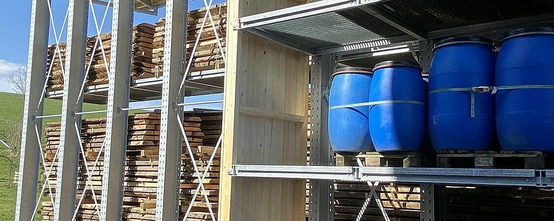 Tot nu toe had Nyfeler beukenblokken opgeslagen, die de schrijnwerkerij gebruikte voor de productie van de CUBORO-knikkerbaansystemen, evenals brandhout en andere items die buiten worden gestapeld. Maar de europallets die voor dit doel werden gebruikt, raakten voortdurend verweerd, wat resulteerde in gevaarlijk scheve stapels. Om bij de goederen te komen, moesten de artikelen ook voortdurend opnieuw worden gestapeld. Om ze tegen het weer te beschermen, dekte Nyfeler ook elke stapel met zeildoeken af, wat voor veel extra handelingen zorgde. Tenslotte nam het magazijn een te grote oppervlakte in beslag.