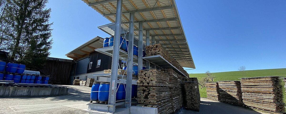Het steil aflopende terrein en de krappe ruimte stelden bijzondere eisen aan het ontwerp van een nieuwe buitenstelling voor de schrijnwerkerij Nyfeler Holzwaren AG. OHRA verdeelde de dubbelzijdige draagarmstelling uiteindelijk in een oost- en een westzijde, die ondanks niveauverschillen van de ondergrond en een verspringende uitbouw worden beschermd door een gemeenschappelijk zes meter diep dak. Met de nieuwe stelling wint Nyfeler aanzienlijk meer opslagruimte, bespaart het tijd bij het opslaan en ophalen en heeft men dankzij de bescherming tegen het weer minder schade aan de opgeslagen goederen.