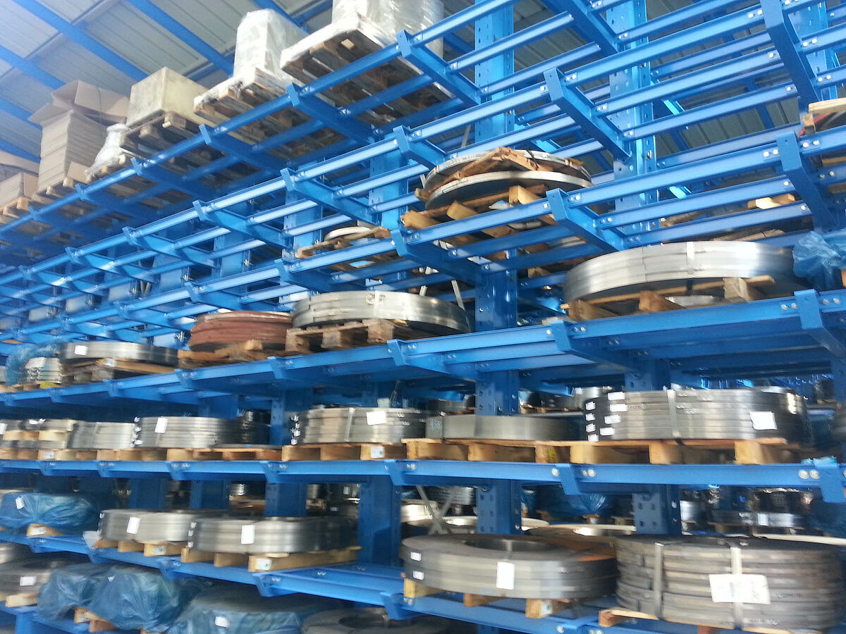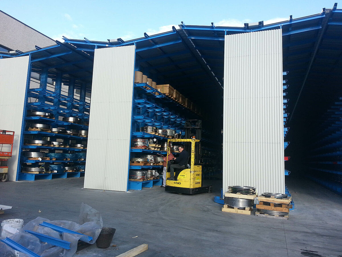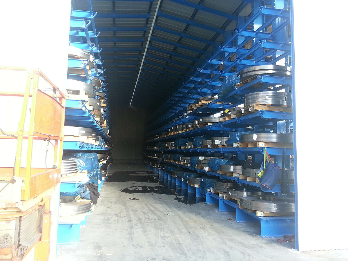 In de eerste drie stellinggangen wordt het 6500 millimeter lange en 4000 kilogram zware, gebundelde staafmateriaal dubbeldiep op negen niveaus opgeslagen. De draagarmen van de stelling zijn ingehangen en kunnen met schroeven op de millimeter nauwkeurig worden uitgelijnd. Zo is een gelijkmatig opleggen van de opslaggoederen gegarandeerd. Deze gangen worden bediend met een vierzijdige vorkheftruck, die geleid wordt over op de staanders aangebrachte rails. De overige stellinggangen zijn uitgerust met armbruggen en bieden zo een doorlopend opslagoppervlak op zeven niveaus. Hier worden de tot 1200 kilogram zware plaatbanden op pallet opgeslagen. Deze gangen worden bediend met een vorkheftruck.