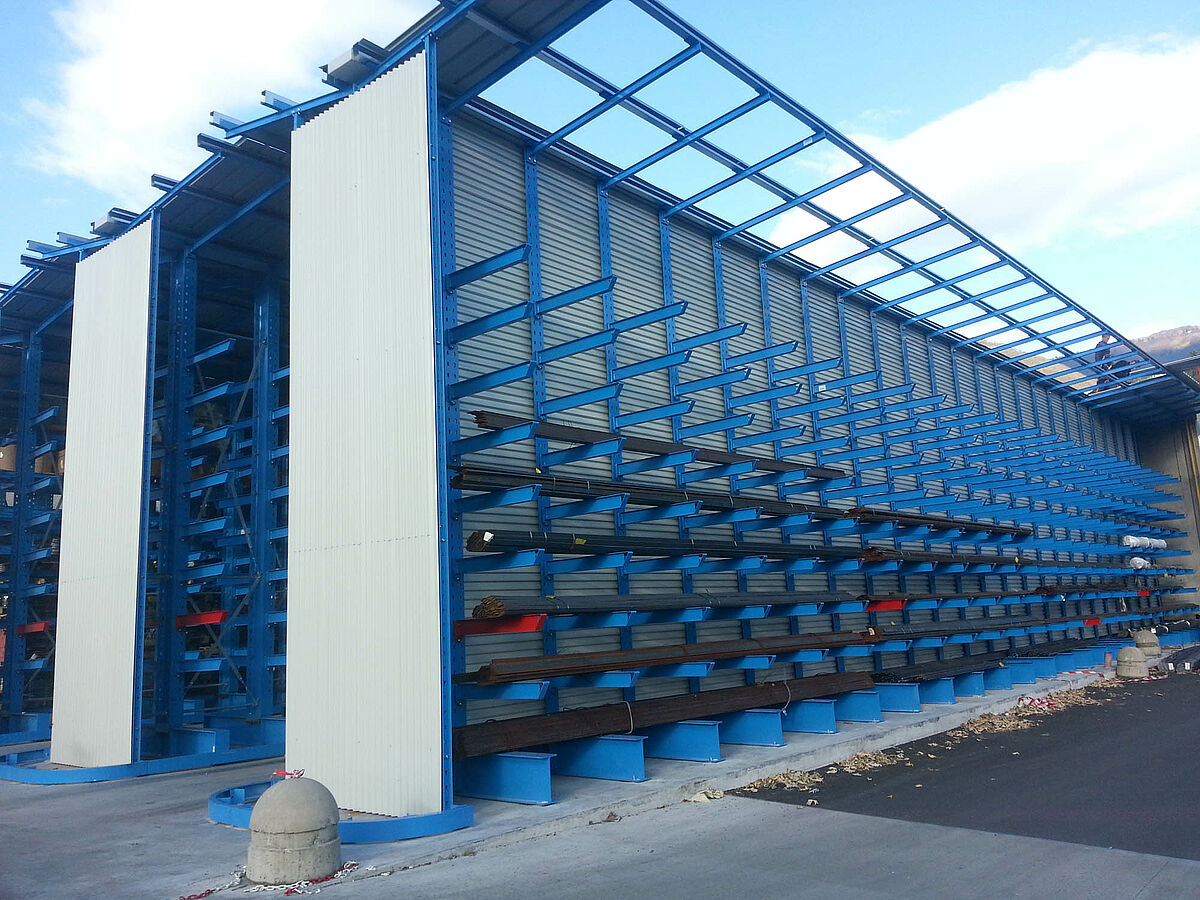 Het stellingsysteem met ingehangen draagarmen maakt een hoge flexibiliteit mogelijk. Afhankelijk van de eisen kunnen de opslaglocaties van de verschillende materialen worden gewijzigd en omgewisseld.