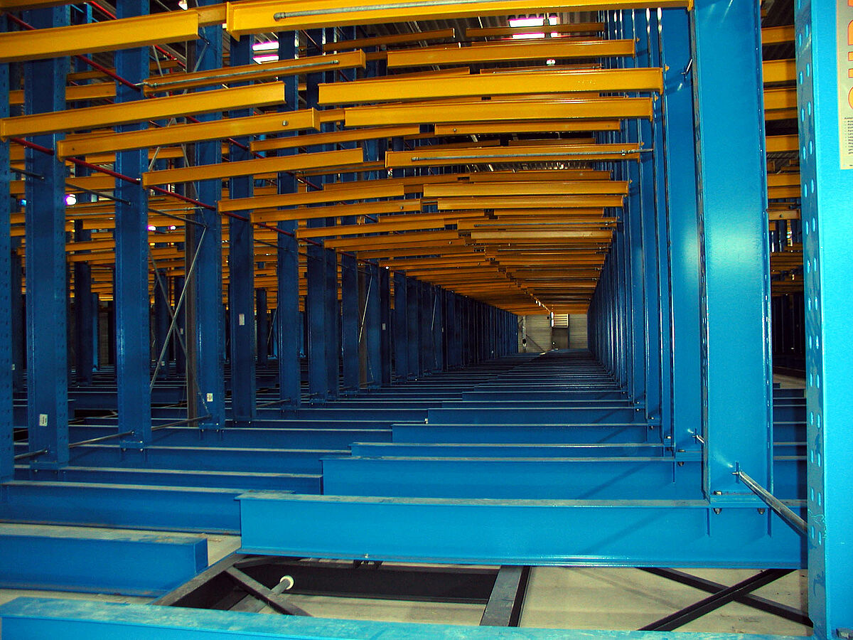 Omwille van het grote volume zijn de coulissen bijzonder moeilijk op te slaan, en toch moeten ze snel gehanteerd kunnen worden en binnen handbereik zijn. Daarom heeft men gekozen voor een verrijdbare draagarmstelling . Op de draagarmen van 2.500 mm werden de grootste paletten (2,2 x 6 m) op 3 niveau’s en met een vakhoogte van 2.100 mm gestapeld. In het staatstheater werden 6 verrijdbare sokkels geproduceerd met op iedere sokkel een 60 meter lange dubbelzijdige draagarmstelling.