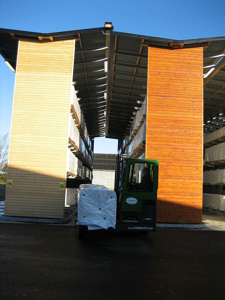 Eveneens werd de plaatselijke heftruckdealer van begin aan in het project mee betrokken. De gangpaden werden met geleidingsrails ontworpen, conform aan de eisen van de zijdelingse heftruck. De ingangsbereiken aan beide zijden van de gangpaden werden door bekleedde Displayramen tegen wind en water beschermd. De overlappende dakelementen beschermen tegen directe weersinvloeden en zorgen echter tegelijkertijd voor voldoende ventilatie. De buitenste stellingen werden met een waterdichte wand bekleed, dat eveneens als weerbescherming dient.
