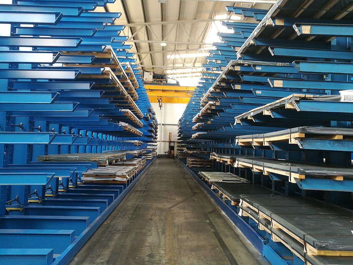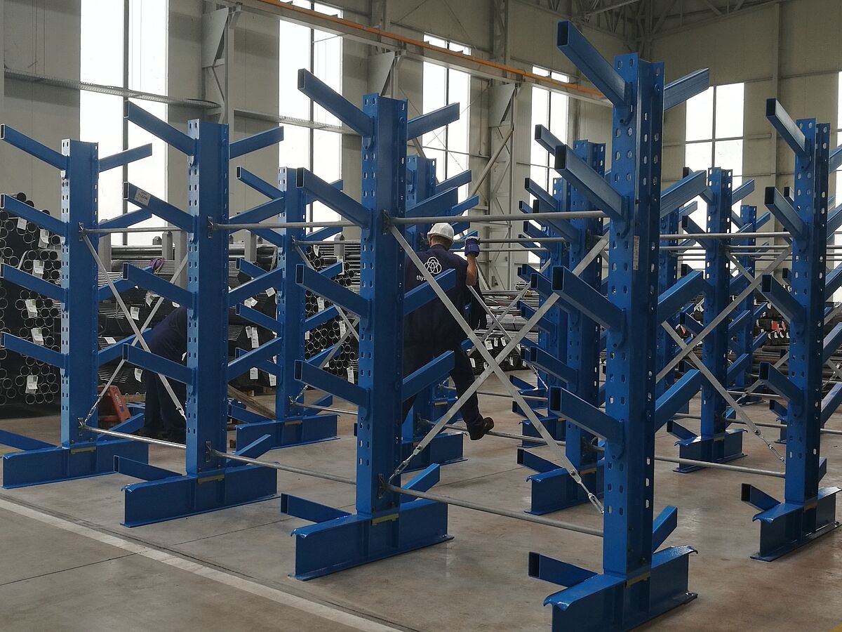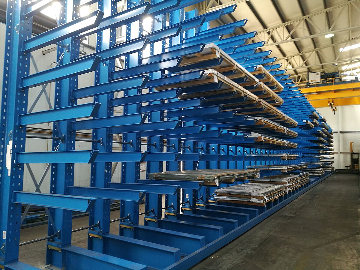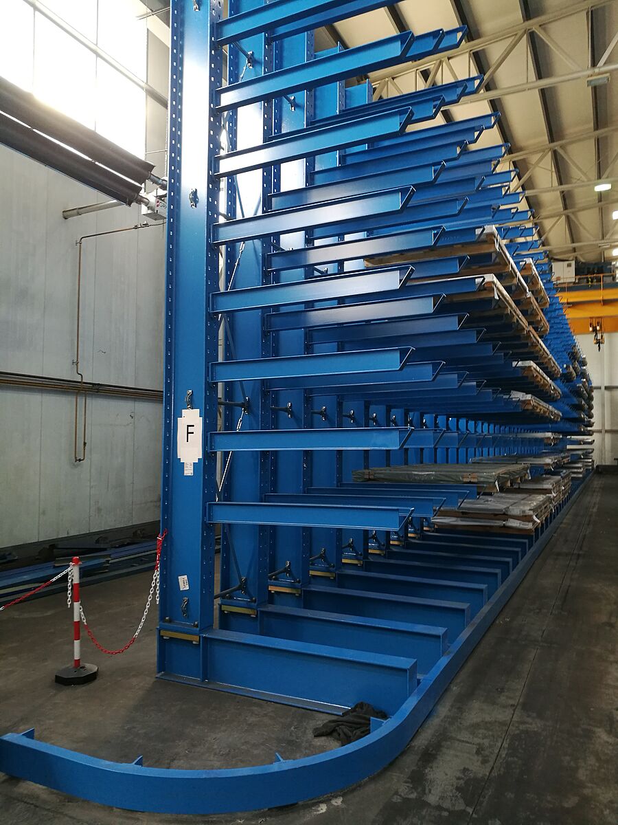 In een tweede opslagruimte installeerde OHRA ook zeven lijnen van zijn draagarmstellingen met schuine armen. Hier worden buizen, profielen en staven met een kraan opgeslagen. Bij dit type stelling worden de draagarmen met een hellingshoek van 20° gefabriceerd. Het lange goederenpakket glijdt zo in het daarvoor bestemde compartiment, wat het opslaan met de kraan aanzienlijk vereenvoudigt. Ook bij de draagarmstelling met schuine armen zwenken de armen. De bij thyssenkrupp Materials gemonteerde stellingen zijn 2,5 meter hoog en bieden op zeven niveaus plaats aan goederen tot 6.000 millimeter lang.