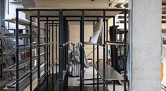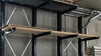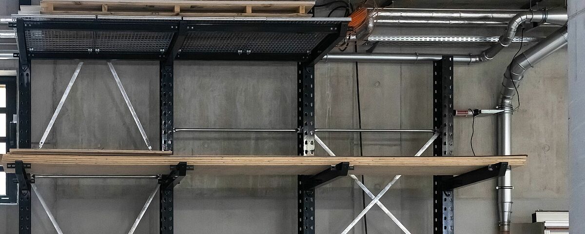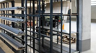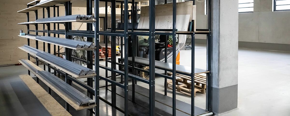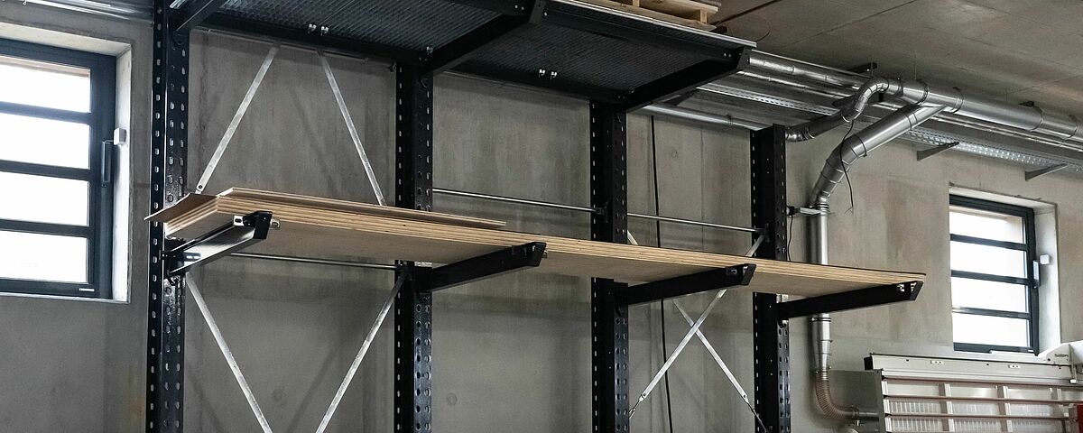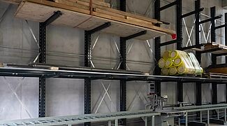 De voor het nieuwe magazijn ontworpen stellingsystemen bestaan uit een thermisch verzinkte, ongeveer 16 meter lange draagarmstelling voor buitengebruik, daarnaast werden er in de hal nog een 15 en een 3 meter lange draagarmstelling geplaatst. Deze ongeveer zeven meter hoge draagarmstellingen bieden duidelijk meer opslagcapaciteit, dan de vloeropslag en de aanzienlijk lagere draagarmstellingen op de oude locatie. De tot 1000kg per arm belastbare draagarmen zijn daarnaast gedeeltelijk uitgerust met roosters en armburggen . Hierdoor is het mogelijk om een grote variëteit aan hout, consignatieartikelen en palletformaten in deze draagarmstellingen op te slaan. Daarnaast is het door de flexibele draagamen mogelijk om de stapelhoogtes van de afzonderlijke opslagniveaus makkelijk aan te passen . Voor de opslag van platen met verschillende afmetingen werden er daarnaast nog twee Platenstellingen geplaatst. Hierin kunnen de platen verticaal worden opgeslagen en is de gewenste plaat snel en makkelijk toegankelijk. Alle binnenstellingen werden op verzoek van „Ihre Zimmerei” gepoedercoat in een aantrekkelijke antracietgrijze kleur (RAL 7016).