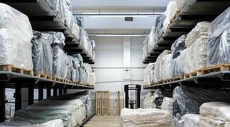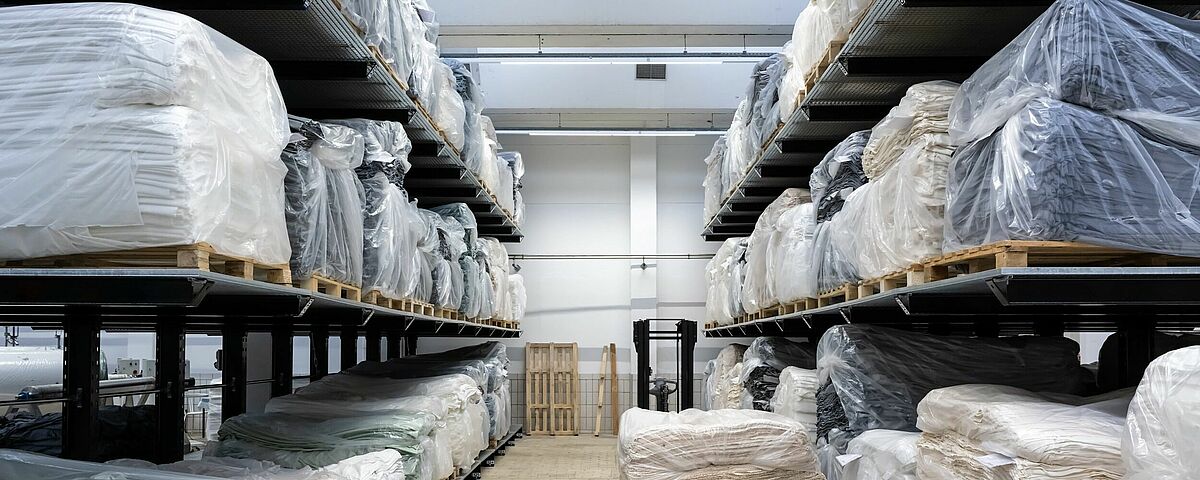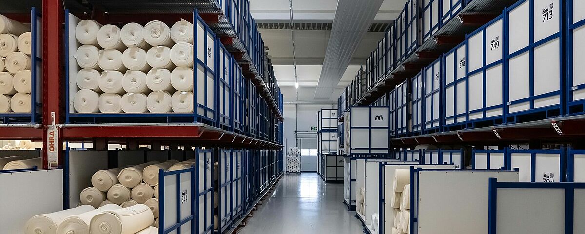 trigema, Duitslands grootste fabrikant van sport- en vrijetijdskleding, wist haar productie aanzienlijk te versnellen door over te schakelen van vloeropslag op palletstellingen. Hiertoe installeerde OHRA draagarm- en palletstellingen voor de tussenopslag van de stoffen die in de eigen breifabriek worden geproduceerd, in afwachting van hun transport naar de afwerkingslijn. De materialen kunnen in verschillende toestanden op roosters worden opgeslagen, ongeacht hun formaat of de opslaghulpmiddelen. Dankzij de opslag in de OHRA-stellingen wist TRIGEMA haar productie-efficiëntie met 5 procent te verhogen.